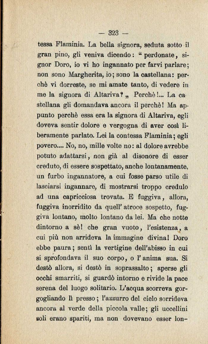 tessa Flaminia. La bella signora| seduta sotto il gran pino| gli veniva dioendo : a perdonate| signor Doro| io vi ho ingannato per farvi parlare ; non sono Margherita| io ; sono la castellana: perchè vi dorreste| se mi amate tanto| di vedere in me la signora di Altariva? „ Perchè!... La ca stellana gli domandava ancora il perchè ! Ma appunto perchè essa era la signora di Altariva| egli doveva sentir dolore e vergogna di aver cosi liberamente parlato. Lei la contessa Flaminia ; egli povero.... No| no| mille volte no : al dolore avrebbe potuto adattarsi| non già al disonore di esser creduto| di essere sospettato| anohe lontanamente| un furbo ingannatore| a cui fosse parso utile di lasoiarsi ingannare| di mostrarsi troppo credulo ad una oapricoiosa trovata. E fuggiva| allora| fuggiva inorridito da quell' atroce sospetto| fuggiva lontano| molto lontano da lei. Ma ohe notte dintorno a sè ! che gran vuoto| l'esistenza| a cui più non arrideva la immagine divinai Doro ebbe paura; sentì la vertigine dell'abisso in cui si sprofondava il suo corpo| o 1' anima sua. Si destò allora| si destò in soprassalto ; aperse gli occhi smarriti| si guardò intorno e rivide la pace serena del luogo solitario. L'acqua scorreva gorgogliando lì presso ; l'azzurro del cielo sorrideva ancora al verde della piccola valle; gli uccellini soli erano spariti| ma non dovevano esser lon-