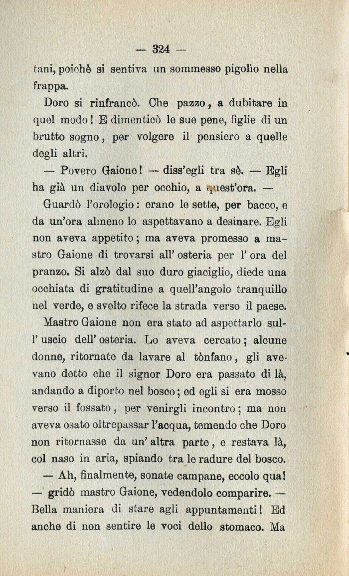 Guardò l'orologio : erano le sette| per bacco| e da un'ora almeno lo aspettavano a desinare. Egli non aveva appetito ; ma aveva promesso a mastro Gaione di trovarsi all' osteria per 1' ora del pranzo. Si alzò dal suo duro giaciglio| diede una occhiata di gratitudine a quell'angolo tranquillo nel verde| e svelto rifece la strada verso il paese.