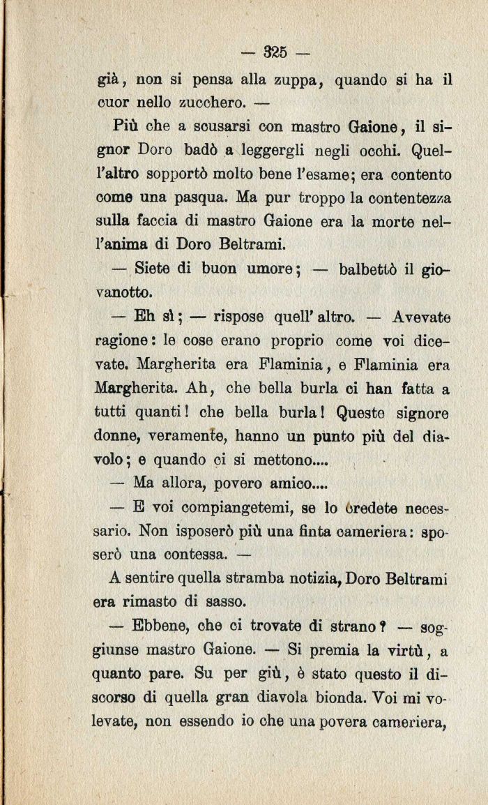 — Eh s\; — rispose quell'altro. — Avevate ragione : le cose erano proprio come voi dicevate. Margherita era Flaminia| e Flaminia era Margherita. Ah| che bella burla ci han fatta a tutti quanti ! che bella burla ! Queste signore donne| veramente| hanno un punto più del diavolo; e quando ci si mettono....