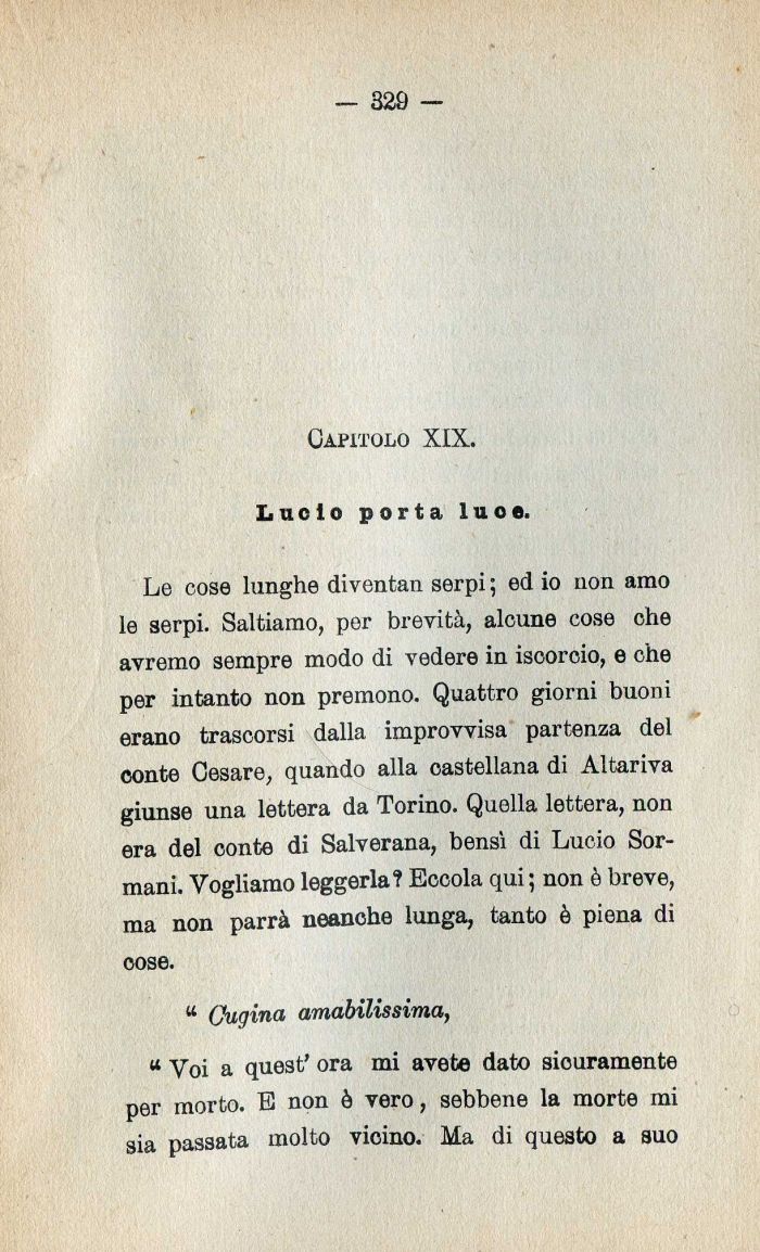 Le cose lunghe diventan serpi ; ed io non amo le serpi. Saltiamo| per brevità| alcune cose che avremo sempre modo di vedere in isoorcio| e che per intanto non premono. Quattro giorni buoni erano trascorsi dalla improvvisa partenza del conte Cesare| quando alla castellana di Altariva giunse una lettera da Torino. Quella lettera| non era del conte di Salverana| bensì di Lucio Sor-mani. Vogliamo leggerla? Eccola qui; non è breve| ma non parrà neanche lunga| tanto è piena di oose.
