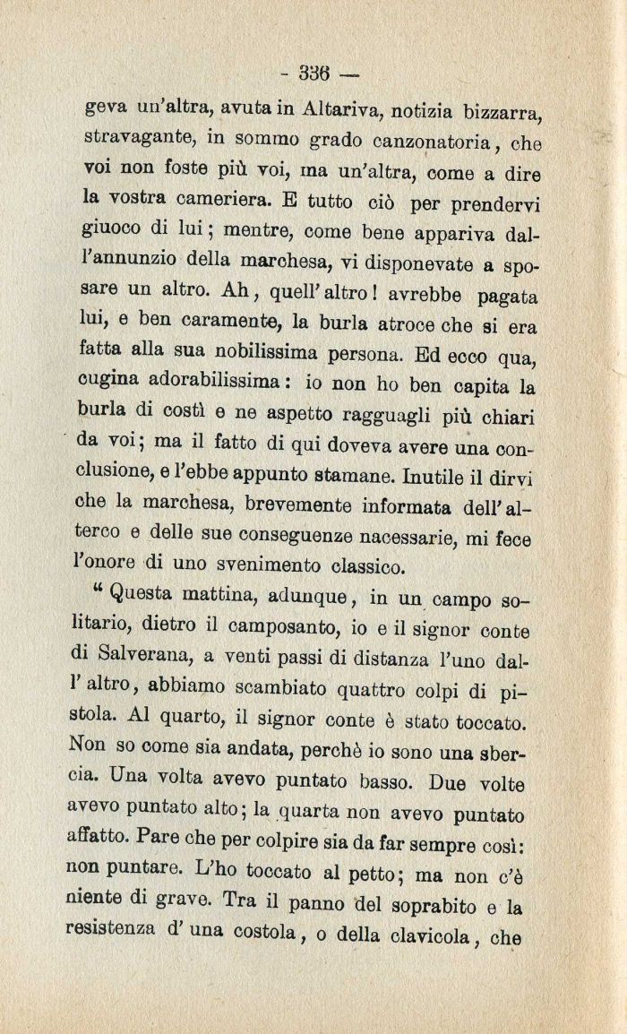 ' Questa mattina| adunque| in un campo solitario| dietro il camposanto| io e il signor conte di Salverana| a venti passi di distanza l'uno dall' altro| abbiamo scambiato quattro colpi di pistola. Al quarto| il signor conte è stato toccato. Non so come sia andata| perchè io sono una sbercia. Una volta avevo puntato basso. Due volte avevo puntato alto; la quarta non avevo puntato affatto. Pare ohe per colpire sia da far sempre così: non puntare. L'ho toccato al petto ; ma non c'è niente di grave. Tra il panno del soprabito e la resistenza d' una costola| o della clavicola| che