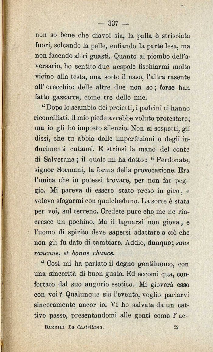 ' Cosi mi ha parlato il degno gentiluomo| con una sincerità di buon gusto. Ed eccomi qua| confortato dal suo augurio esotico. Mi gioverà esso con voi ? Qualunque sia l'evento| voglio parlarvi sinceramente ancor io. Vi ho salvata da un cattivo passo| presentandomi alle genti come l'ac-Barrii.i. La Castellana. 22