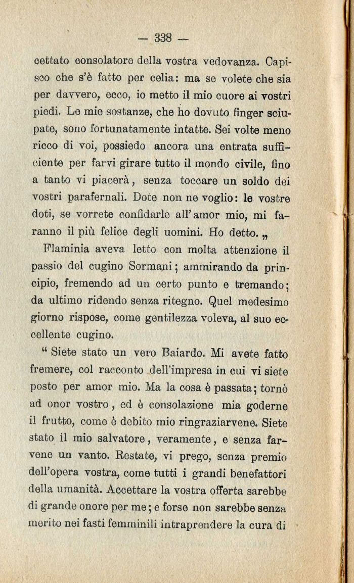 Flaminia aveva letto con molta attenzione il passio del cugino Sormani ; ammirando da principio| fremendo ad un certo punto e tremando; da ultimo ridendo senza ritegno. Quel medesimo giorno rispose| come gentilezza voleva| al suo eccellente cugino.
