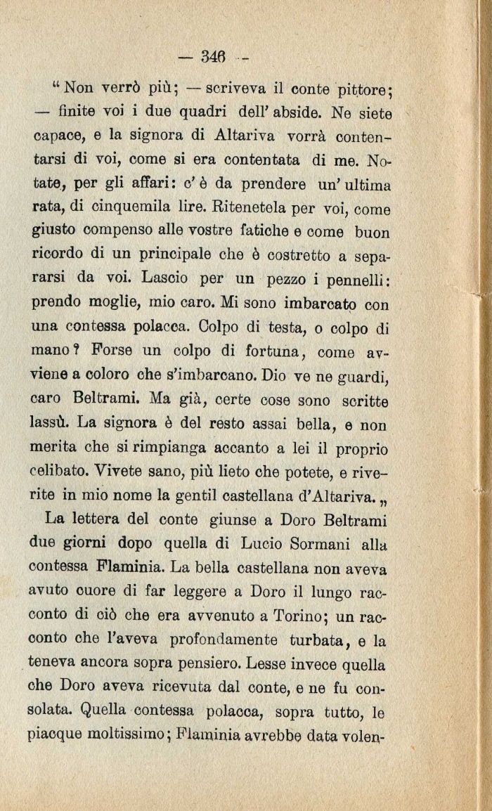 ' Non verrò più ; — scriveva il conte pittore ; — finite voi i due quadri dell' abside. Ne siete capace| e la signora di Altariva vorrà contentarsi di voi| come si era contentata di me. Notate| per gli affari: c'è da prendere un'ultima rata| di cinquemila lire. Ritenetela per voi| come giusto compenso alle vostre fatiche e come buon ricordo di un principale che è costretto a separarsi da voi. Lascio per un pezzo i pennelli: prendo moglie| mio caro. Mi sono imbarcato con una contessa polacca. Colpo di testa| o colpo di mano? Porse un colpo di fortuna| come avviene a coloro che s'imbarcano. Dio ve ne guardi| caro Beltrami. Ma già| certe cose sono scritte lassù. La signora è del resto assai bella| e non merita che si rimpianga accanto a lei il proprio celibato. Vivete sano| più lieto che potete| e riverite in mio nome la gentil castellana d'Altariva. „ La lettera del conte giunse a Doro Beltrami due giorni dopo quella di Luoio Sormani alla contessa Flaminia. La bella castellana non aveva avuto ouore di far leggere a Doro il lungo racconto di ciò che era avvenuto a Torino; un racconto che l'aveva profondamente turbata| e la teneva ancora sopra pensiero. Lesse invece quella che Doro aveva ricevuta dal conte| e ne fu consolata. Quella contessa polacca| sopra tutto| le piacque moltissimo ; Flaminia avrebbe data volen-