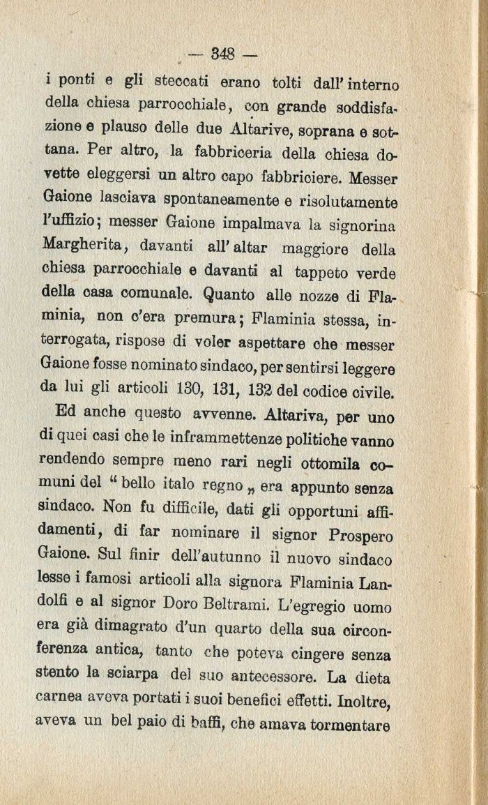 Ed anche questo avvenne. Altariva| per uno di quei casi che le inframmettenze politiche vanno rendendo sempre meno rari negli ottomila comuni del ' bello italo regno era appunto senza sindaco. Non fu difficile| dati gli opportuni affidamenti| di far nominare il signor Prospero Gaione. Sul finir dell'autunno il nuovo sindaco lesse i famosi articoli alla signora Flaminia Lan-dolfi e al signor Doro Beltrami. L'egregio uomo era giā dimagrato d'un quarto della sua oircon-ferenza antica| tanto che poteva cingere senza stento la sciarpa del suo antecessore. La dieta carnea avova portati i suoi benefici effetti. Inoltre| aveva un bel paio di baffi| che amava tormentare