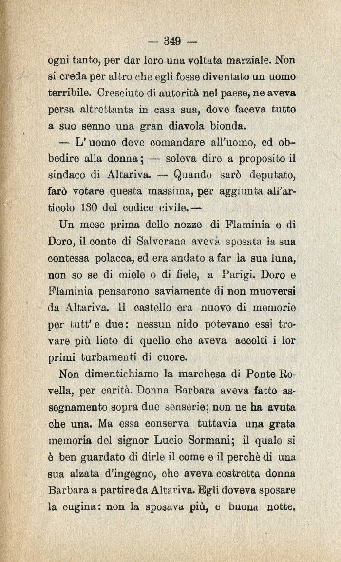 — L'uomo deve comandare all'uomo| ed obbedire alla donna ; — soleva dire a proposito il sindaco di Altariva. — Quando sarò deputato| farò votare questa massima| per aggiunta all'articolo 130 del codice civile.—