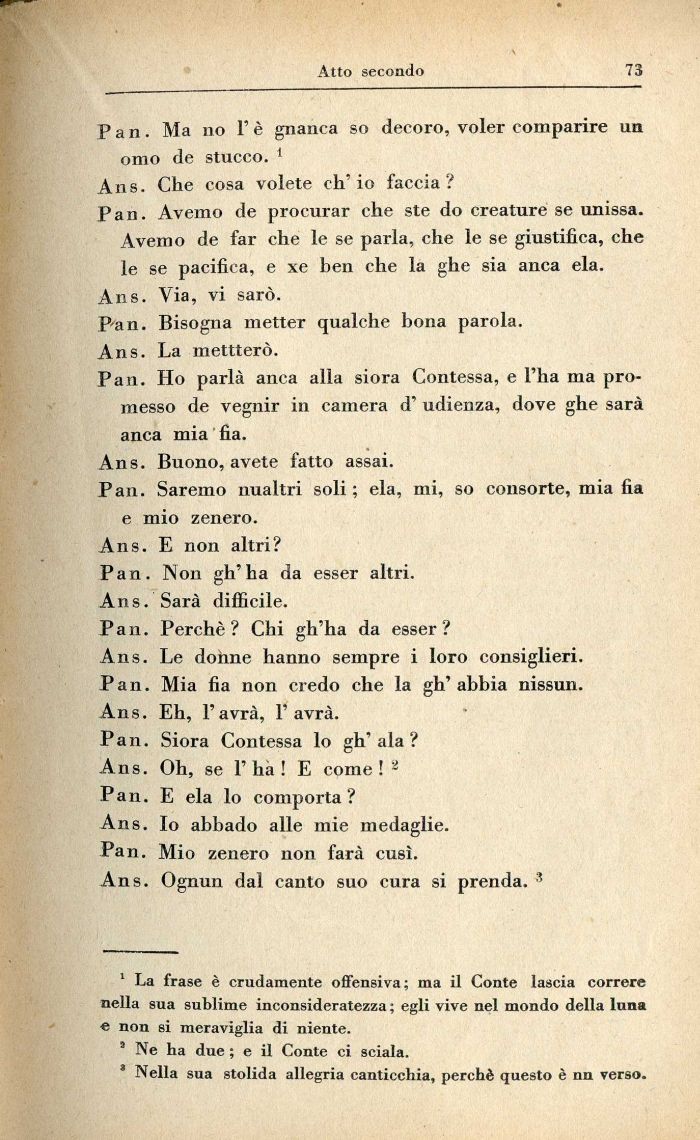 e mio zenero. Ans. E non altri? Pan. Non gh'ha da esser altri. Ans. Sarà difficile. Pan. Perchè? Chi gh'ha da esser? Ans. Le donne hanno sempre i loro consiglieri, Pan. Mia fia non credo che la gh'abbia nissun. Ans. Eh, l'avrà, l'avrà. Pan. Siora Contessa lo gh'ala ? Ans. Oh, se l'ha! E come!2 Pan. E eia lo comporta? Ans. Io abbado alle mie medaglie. Pan. Mio zenero non farà cusì. Ans. Ognun dal canto suo cura si prenda. 3