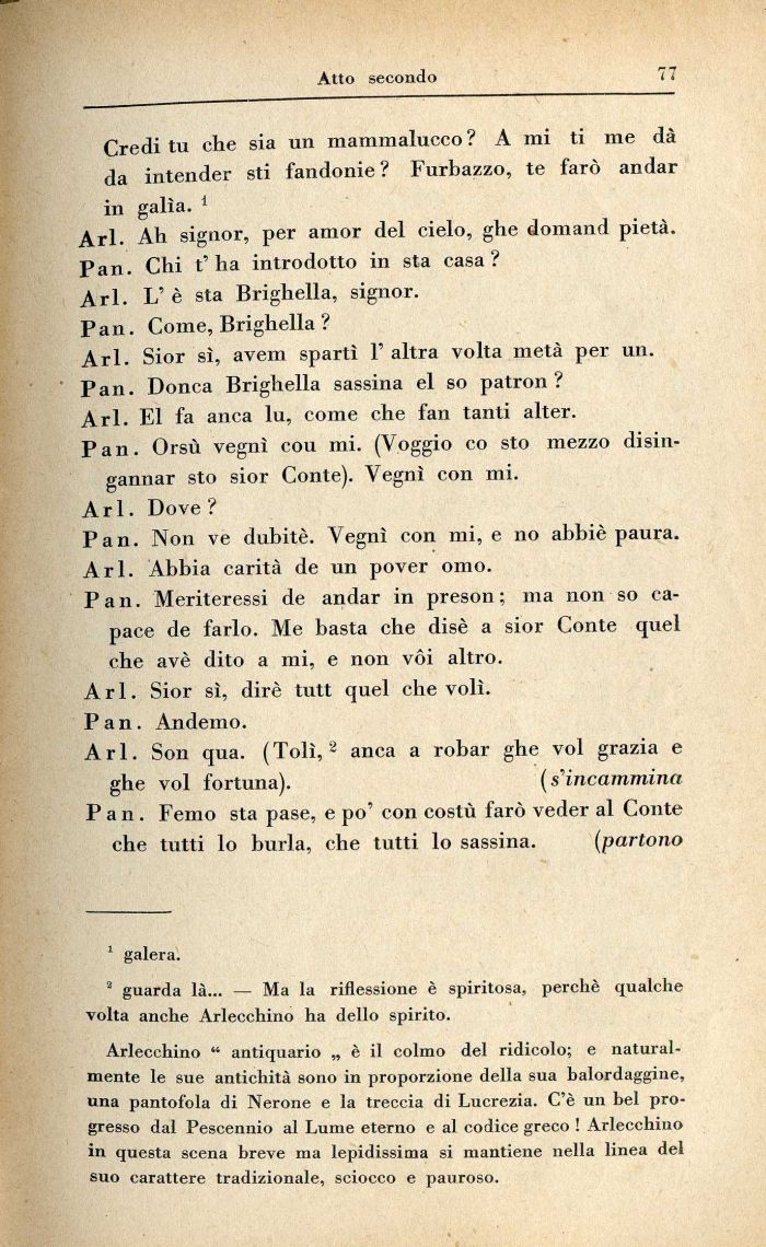 Arlecchino ' antiquario „ è il colmo del ridicolo; e naturalmente le sue antichità sono in proporzione della sua balordaggine, una pantofola di Nerone e la treccia di Lucrezia. C'è un bel progresso dal Pescennio al Lume eterno e al codice greco ! Arlecchino in questa scena breve ma lepidissima si mantiene nella linea del suo carattere tradizionale, sciocco e pauroso.
