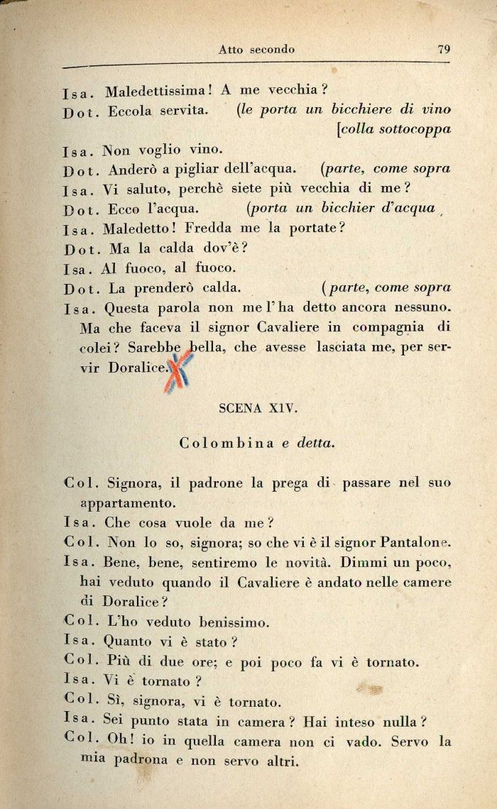 Col. Non Io so, signora; so che vi è il signor Pantalone. Isa. Bene, bene, sentiremo le novità. Dimmi un poco, hai veduto quando il Cavaliere è andato nelle camere di Doralice? Col. L'ho veduto benissimo. Isa. Quanto vi è stato ?