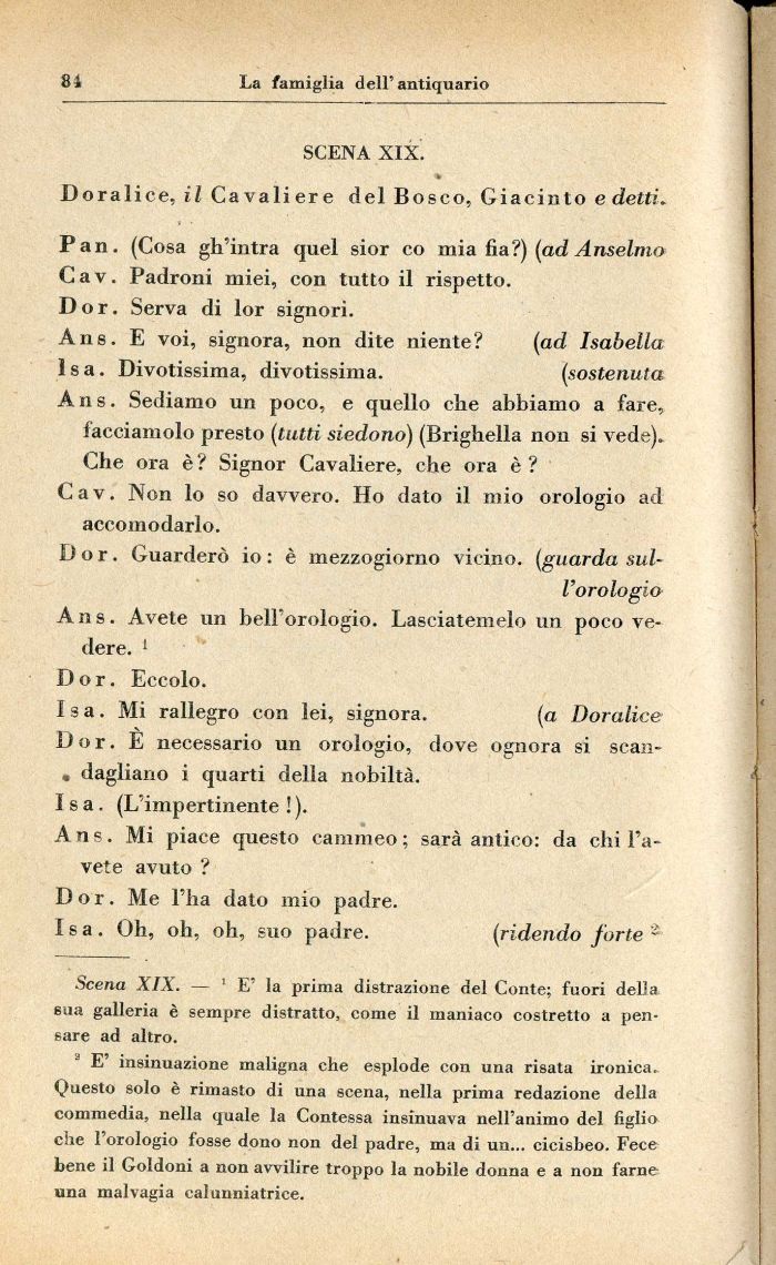 ' E' insinuazione maligna che esplode con una risata ironica. Questo solo è rimasto di una scena, nella prima redazione della commedia, nella quale la Contessa insinuava nell'animo del figlio che l'orologio fosse dono non del padre, ma di un... cicisbeo. Fece bene il Goldoni a non avvilire troppo la nobile donna e a non farne una malvagia calunniatrice.