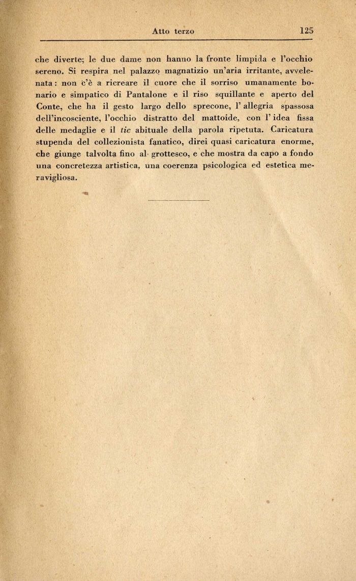 che diverte; le due dame non hanno la fronte limpida e l'occhio sereno. Si respira nel palazzo magnatizio un'aria irritante, avvelenata : non c'è a ricreare il cuore che il sorriso umanamente bonario e simpatico di Pantalone e il riso squillante e aperto del Conte, che ha il gesto largo dello sprecone, l'allegria spassosa dell'incosciente, l'occhio distratto del mattoide, con l'idea fissa delle medaglie e il tic abituale della parola ripetuta. Caricatura stupenda del collezionista fanatico, direi quasi caricatura enorme, che giunge talvolta fino al grottesco, e che mostra da capo a fondo una concretezza artistica, una coerenza psicologica ed estetica meravigliosa.