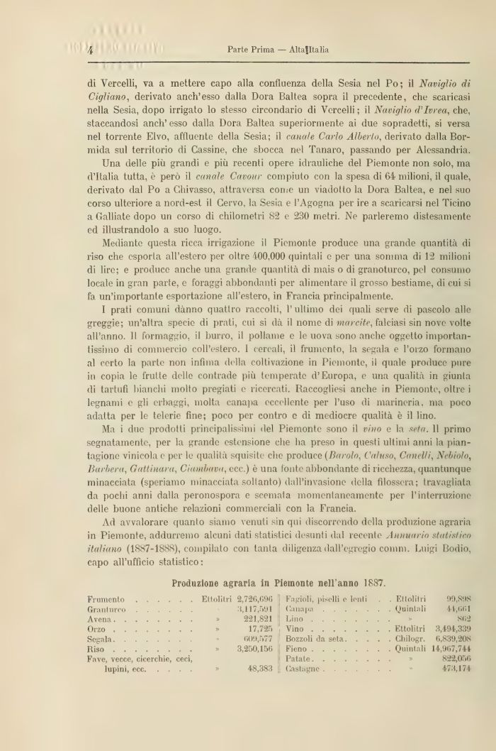 Ad avvalorare quanto siamo venuti sin qui discorrendo della produzione agraria in Piemonte, addurremo alcuni dati statistici desunti dal recente Annuario statistico italiano (1S87-1S88), compilato con tanta diligenza dall'egregio comm. Luigi Bodio, capo all'ufficio statistico: