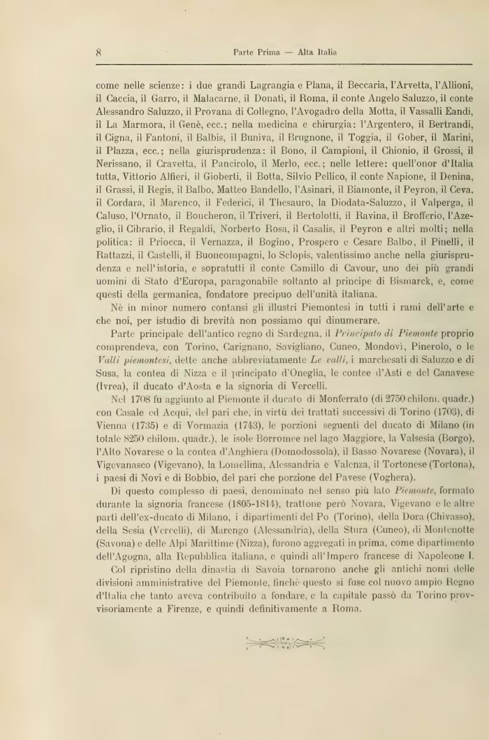 come nelle scienze : i due grandi Lagrangia e Plana, il Beccaria, l'Arvetta, l'Allioni, il Caccia, il Garro, il Malacarne, il Donati, il Roma, il conte Angelo Saluzzo, il conte Alessandro Saluzzo, il Provana di Collegno. l'Avogadro della Motta, il Vassalli Eandi, il La Marmora, il Genè, ecc.; nella medicina e chirurgia: l'Argenterò, il Bertrandi, il Cigna, il Fantoni, il Balbis, il Buniva, il Brugnone, il Toggia, il Gober, il Marini, il Piazza, ecc.; nella giurisprudenza: il Bono, il Campioni, il Chionio, il Grossi, il Nerissano, il Cravetta, il Pancirolo, il Merlo, ecc.; nelle lettere: quell'onor d'Italia tutta, Vittorio Alfieri, il Gioberti, il Botta, Silvio Pellico, il conte Napione, il Denina, il Grassi, il Regis, il Balbo. Matteo Bandello, l'Asinari, il Biainonte, il Peyron, il Ceva, il Cordara, il Marenco, il Federici, il Thesauro, la Diodata-Saluzzo, il Valperga, il Caluso, l'Ornato, il Boucheron, il Triveri, il Bertololti, il Ravina, il Brofferio, l'Azeglio, il Cibrario, il Regaldi, Norberto Rosa, il Casalis, il Peyron e altri molti ; nella politica: il Priocca, il Vernazza, il Bogino, Prospero e Cesare Balbo, il Pinelli, il Rattazzi, il Castelli, il Buoncompagni, lo Sclopis, valentissimo anche nella giurisprudenza e nell'istoria, e sopratutti il conte Camillo di Cavour, uno dei più grandi uomini di Stato d'Europa, paragonabile soltanto al principe di Bismarck, e, come questi della germanica, fondatore precipuo dell'unità italiana.