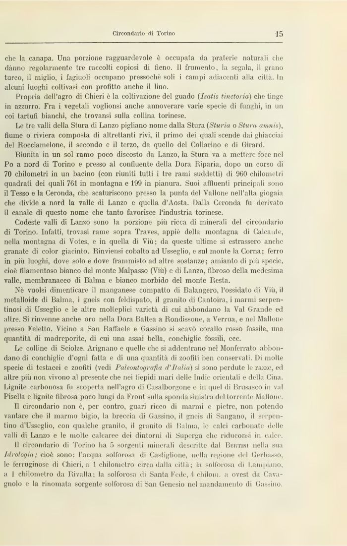 Nè vuoisi dimenticare il manganese compatto di Balangero, l'ossidato di Viù, il metalloide di Balma, i gneis con feldispato, il granito di Cantoira, i marmi serpen-tinosi di Usseglio e le altre molteplici varietà di cui abbondano la Val Grande ed altre. Si rinvenne anche oro nella Dora Baltea a Rondissone, a Verrua, e nel Mallone presso Feletto. Vicino a San Raffaele e Gassino si scavò corallo rosso fossile, una quantità di madreporite, di cui una assai bella, conchiglie fossili, ecc.
