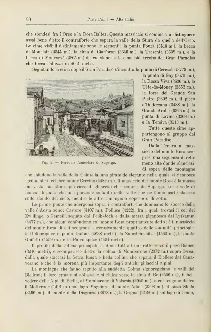 che stendesi fra l'Orco e la Dora Baltea. Questo massiccio si comincia a distinguere assai bene dietro il contrafforte che separa la valle della Stura da quella dell'Orco. Le cime visibili distintamente sono le seguenti: la punta Fourà (3410 m.), la becca di Monciair (3544 in.), la cima di Ciarforon (3640 m.), la Tresenta (3609 m.), e la becca di Moncorvè (3865 m.) da cui slanciasi la cima più eccelsa del Gran Paradiso che tocca l'altezza di 4061 metri.