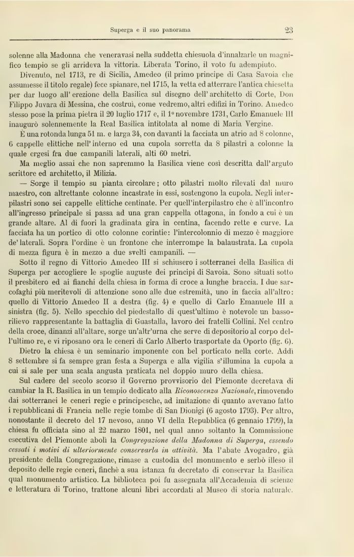 Sotto il regno di Vittorio Amedeo III si schiusero i sotterranei della Basilica di Superga per accogliere le spoglie auguste dei principi di Savoia. Sono situati sotto il presbitero ed ai fianchi della chiesa in forma di croce a lunghe braccia. I due sarcofaghi più meritevoli di attenzione sono alle due estremità, uno in faccia all'altro : quello di Vittorio Amedeo II a destra (fig. 4) e quello di Carlo Emanuele 111 a sinistra (fig. 5). Nello specchio del piedestallo di quest'ultimo è notevole un bassorilievo rappresentante la battaglia di Guastalla, lavoro dei fratelli Collini. Nel centro della croce, dinanzi all'altare, sorge un'altr'urna che serve di depositorio al corpo dell'ultimo re, e vi riposano ora le ceneri di Carlo Alberto trasportate da Oporto (fig. 6).