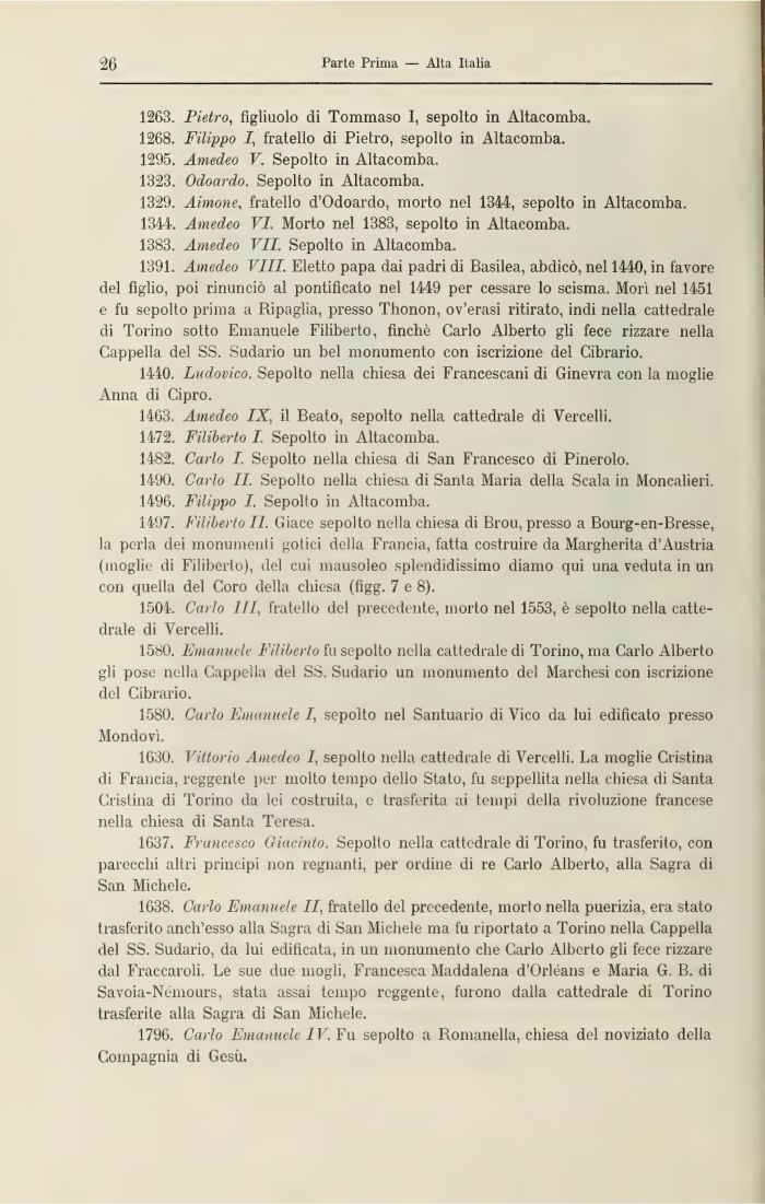 1391. Amedeo Vili. Eletto papa dai padri di Basilea, abdicò, nel 1440, in favore del figlio, poi rinunciò al pontificato nel 1449 per cessare lo scisma. Morì nel 1451 e fu sepolto prima a Bipaglia, presso Thonon, ov'erasi ritirato, indi nella cattedrale di Torino sotto Emanuele Filiberto, finché Carlo Alberto gli fece rizzare nella Cappella del SS. Sudario un bel monumento con iscrizione del Cibrario.