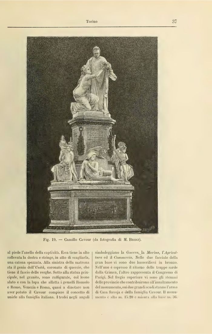 al piede l'anello della captività. Essa tiene in alto sollevata la destra e stringe, in atto di scagliarla, una catena spezzata. Alla sinistra della matrona sta il genio dell' Unità, coronato di quercie, che tiene il fascio delle verghe. Sotto alla statua principale, nel granito, sono raffigurate, col leone alato e con la lupa che allatta i gemelli Romolo e Remo, Venezia e Roma, quasi a dinotare non aver potuto il Cavour compiere, il concetto di unirle alla famiglia italiana. 1 trofei negli angoli