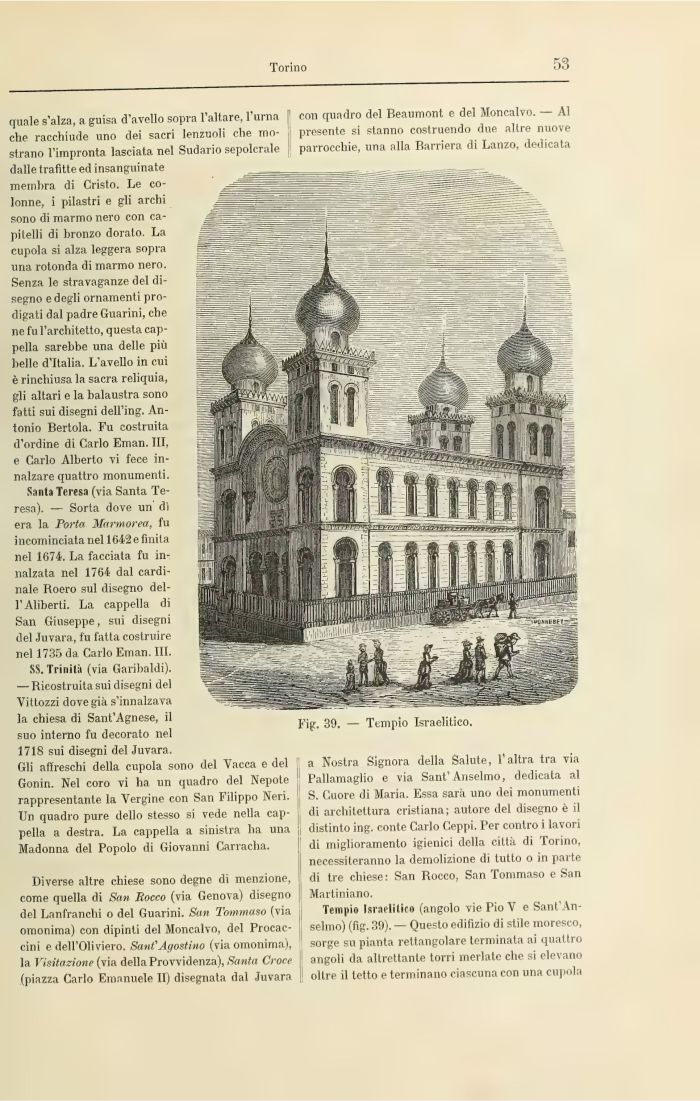Tempio Israelitico (angolo vie Pio V e Sant'Anselmo) (fig. 39). — Questo edifizio di stile moresco, sorge su pianta rettangolare terminata ai quattro angoli da altrettante torri merlate che si elevano oltre il tetto e terminano ciascuna con una cupola