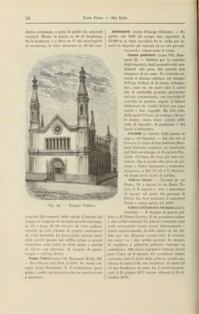 Iniquo Valdese (corso Vili. Emanuele II) (fig. 40). — Fu edificato dal 1851 al 1853. Ne diede i disegni Luigi Formento. È d'architettura quasi gotica e nella sua leggerezza ha un aspetto grave e maestoso.