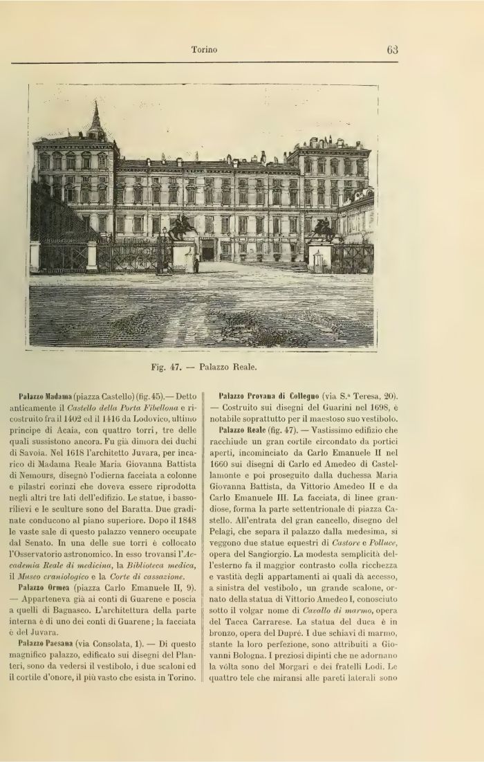 Palazzo lleale (fig. 47). — Vastissimo edilizio che racchiude un gran cortile circondato da portici aperti, incominciato da Carlo Emanuele li nel 1000 sui disegni di Carlo ed Amedeo di Castel-lanionte e poi proseguito dalla duchessa Maria Giovanna Battista, da Vittorio Amedeo II e da Carlo Emanuele III. La facciata, di linee grandiose, forma la parte settentrionale di piazza Castello. All'entrata del gran cancello, disegno del Pelagi, che separa il palazzo dalla medesima, si veggono due statue equestri di Castore e Polluce, opera del Sangiorgio. La modesta semplicità dell'esterno fa il maggior contrasto colla ricchezza e vastità degli appartamenti ai quali dà accesso, a sinistra del vestibolo, un grande scalone, ornato della statua di Vittorio Amedeo I, conosciuto sotto il volgar nome di Cavallo di marmo, opera del Tacca Carrarese. La statua del duca è in bronzo, opera del Dupré. I due schiavi di marmo, stante la loro perfezione, sono attribuiti a Giovanni Bologna. I preziosi dipinti che ne adornano la vòlta sono del Morgari e dei fratelli Lodi. Le quattro tele che miransi alle pareti laterali sono