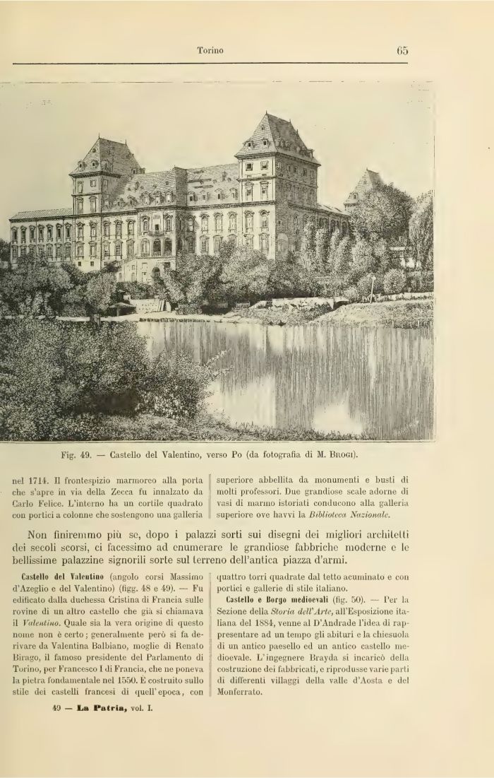 Castello del Valentino (angolo corsi Massimo d'Azeglio e del Valentino) (figg. 48 e 49). — Fu edificato dalla duchessa Cristina di Francia sulle rovine di un altro castello che già si chiamava il Valentino. Quale sia la vera origine di questo nome non è certo ; generalmente però si fa derivare da Valentina Balbiano, moglie di Renalo Birago, il famoso presidente del Parlamento di Torino, per Francesco I di Francia, che ne poneva la pietra fondamentale nel 1550. E costruito sullo stile dei castelli francesi di quell'epoca, con