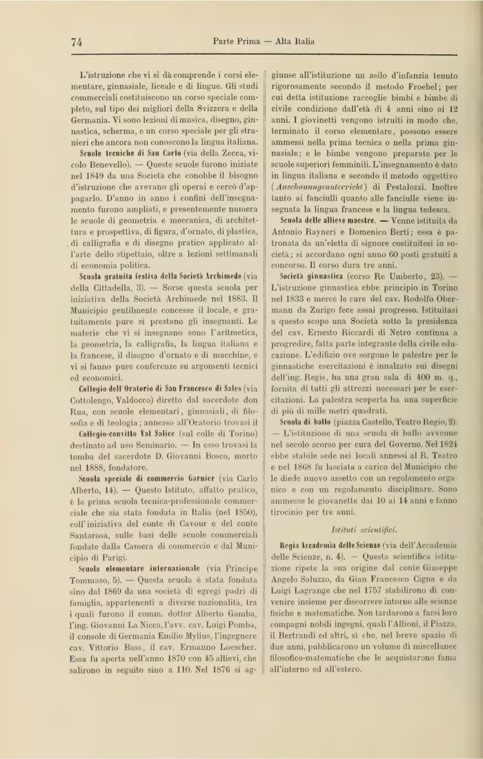 Ilegia Accademia delle Sciente (via dell'Accademia delle Scienze, n. 4), — Questa scientifica istituzione ripete la sua origine dal conte Giuseppe Angelo Saluzzo, da Gian Francesco Cigna e da Luigi Lagrange che nel 1757 stabilirono di convenire insieme per discorrere intorno alle scienze fisiche e matematiche. Non tardarono a farsi loro compagni nobili ingegni, quali l'Allioni, il Piazza, ;j il Bertrandi ed altri, si che, nel breve spazio di due anni, pubblicarono un volume di miscellanee filosofico-matematiche che le acquistarono fama all'interno ed all'estero.