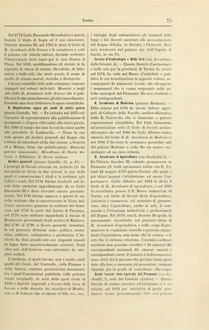 It. Accademia di Agricoltura (via Garibaldi,5).— Re Vittorio Amedeo 111 volendo promuovere in Piemonte gli studi agronomici istituì con R. Patenti 24 maggio 1785 questa Società alla quale i più chiari ingegni s'attribuirono ad onore l'appartenervi. Carlo Alberto nel 1842 le diede il titolo di R. Accademia dì agricoltura, e nel 1865 fu ricostituita presso il R. Museo industriale di Torino col titolo di Società Reale d'agricoltura, industria e commercio, col mandato di promuovere, oltre l'agricoltura, anche le arti, il commercio e l'istruzione industriale e professionale del Regno. Nel 1870, con R. decreto 10 aprile, fu nuovamente ricostituita col primiero titolo di R. Accademia d'agricoltura, e collo scopo di promuovere le cognizioni teoriche e pratiche riguardanti l'agricoltura, non meno che le scienze e le arti che vi abbiano relazione. I membri ordinari residenti non possono eccedere i 50 (onorari 20, corrispondenti nazionali 10, onorari emeriti e corrispondenti esteri il numero è indeterminato); sono eletti fra le persone che pei loro lumi, opere date alla luce, o memorie già presentate, vengono riputate più in grado di contribuire allo scopo.