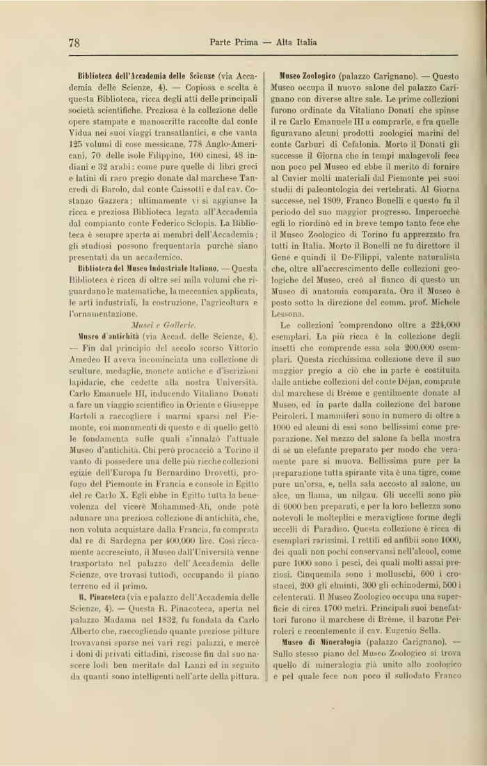 Biblioteca dell'Accademia delle Scienze (via Accademia delle Scienze, 4). — Copiosa e scelta è questa Biblioteca, ricca degli atti delle principali società scientifiche. Preziosa è la collezione delle opere stampate e manoscritte raccolte dal conte Vidua nei suoi viaggi transatlantici, e che vanta 125 volumi di cose messicane, 778 Anglo-Americani, 70 delle isole Filippine, 100 cinesi, 48 indiani e 32 arabi : come pure quelle di libri greci e latini di raro pregio donate dal marchese Tancredi di Barolo, dal conte Caissotti e dal cav. Costanzo Gazzera; ultimamente vi si aggiunse la ricca e preziosa Biblioteca legata all'Accademia dal compianto conte Federico Sclopis. La Biblioteca è sempre aperta ai membri dell'Accademia ; gli studiosi possono frequentarla purché siano presentati da un accademico.