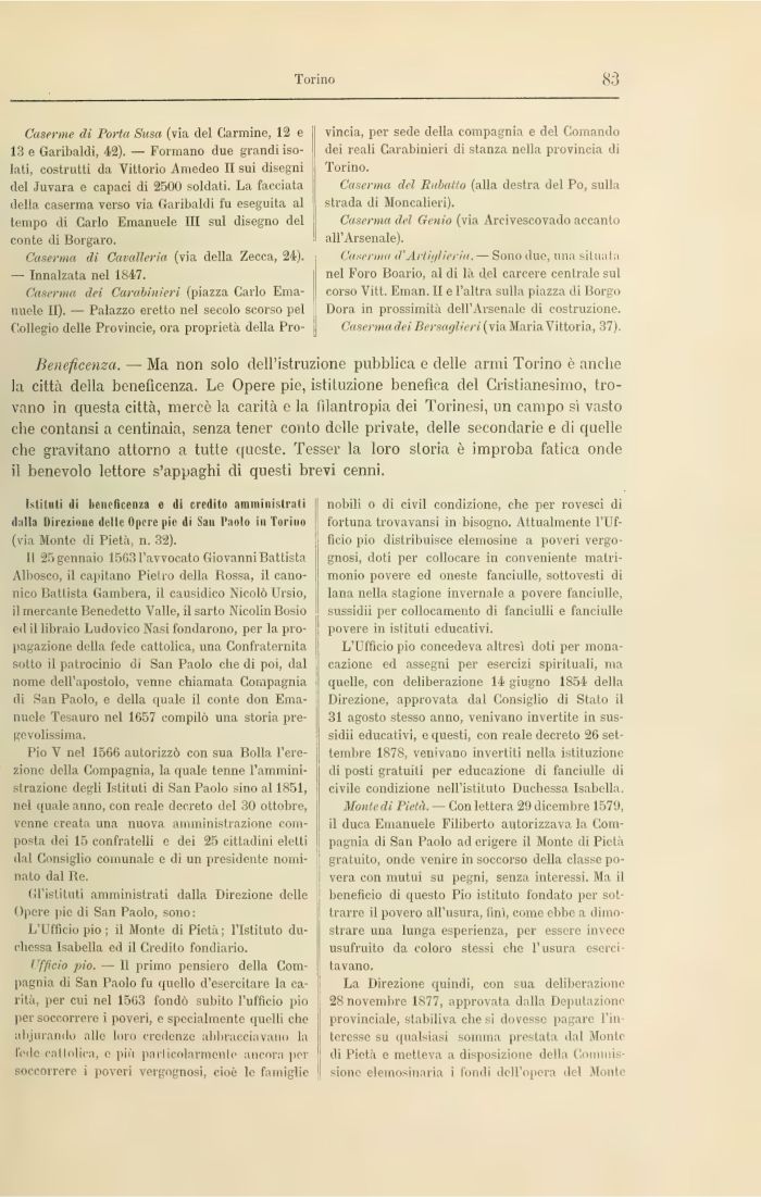Beneficenza. — Ma non solo dell'istruzione pubblica e delle armi Torino è anche la città della beneficenza. Le Opere pie, istituzione benefica del Cristianesimo, trovano in questa città, mercè la carità e la filantropia dei Torinesi, un campo sì vasto che contansi a centinaia, senza tener conto delle private, delle secondarie e di quelle che gravitano attorno a tutte queste. Tesser la loro storia è improba fatica onde il benevolo lettore s'appaghi di questi brevi cenni.
