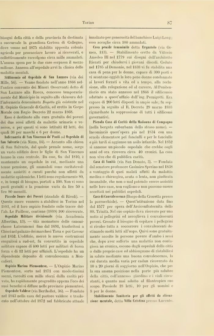 Casa di Convalescenza (Borgo della Crocetta presso la parrocchiale). — Quest'istituzione data fino dal 1577 per opera dell'Arciconfraternita della SS. Trinità. Nel suo ospizio dava ricovero per una notte ai pellegrini ed accoglieva i convalescenti poveri. Cessato il bisogno di ospitare i pellegrini si rivolse tutta a soccorrere i convalescenti destinando molti letti all'uopo. Quivi sono gratuitamente accolte le persone povere d'ambo i sessi che, dopo aver sofferto una malattia non contagiosa nè cronica, escono dagli ospedali della città o dalle proprie case ed abbisognano di ristabilirsi in salute mediante una buona convalescenza, la cui durata media varia per cadun ricoverato da 10 a 20 giorni di soggiorno nell'Ospizio, che pei la sua amena posizione nella parte più salubre della città, coll'annesso giardino e i viali circostanti, è quanto mai adatto al filantropico suo scopo. Possiede 18 letti, 10 per gli uomini e 8 per le donne.