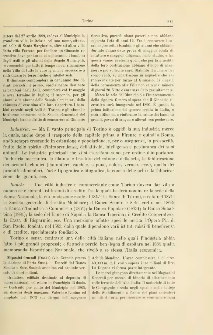 Torino è senza contrasto una delle città italiane nelle quali l'industria abbia fatto i più grandi progressi; e fu anche perciò ben degna di ospitare nel 1884 quella memoranda Esposizione Nazionale, che rivelò a se stessa l'Italia economica.