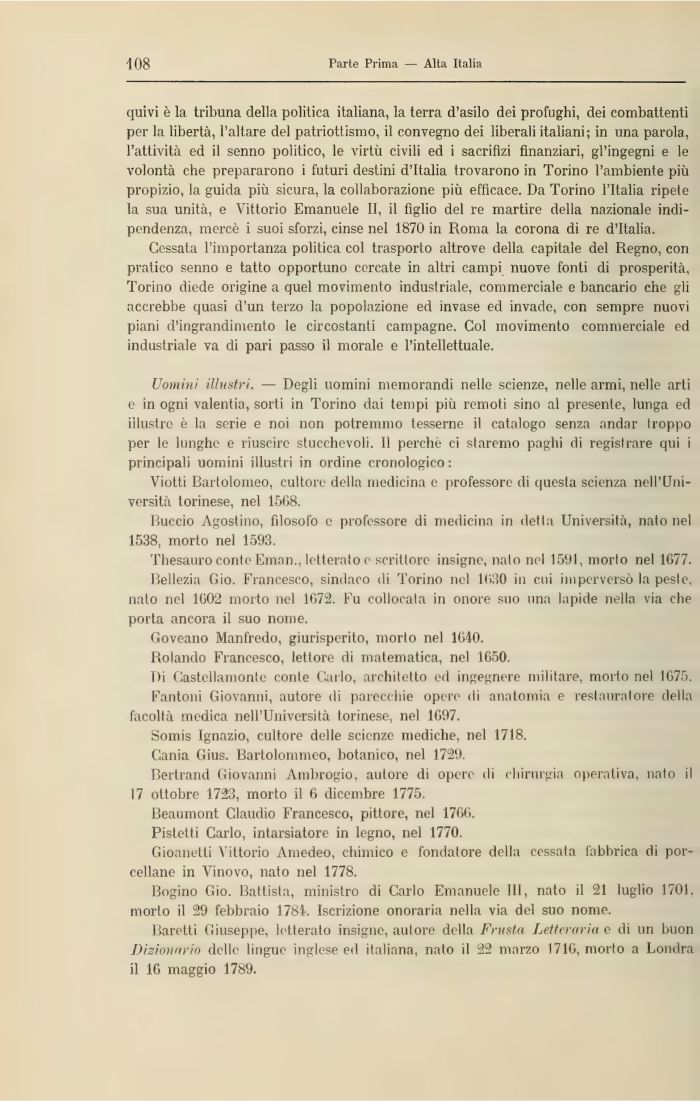 Uomini illustri. — Degli uomini memorandi nelle scienze, nelle armi, nelle arti e in ogni valentia, sorti in Torino dai tempi più remoti sino al presente, lunga ed illustre è la serie e noi non potremmo tesserne il catalogo senza andar troppo per le lunghe e riuscire stucchevoli. 11 perchè ci staremo paghi di registrare qui i principali uomini illustri in ordine cronologico: