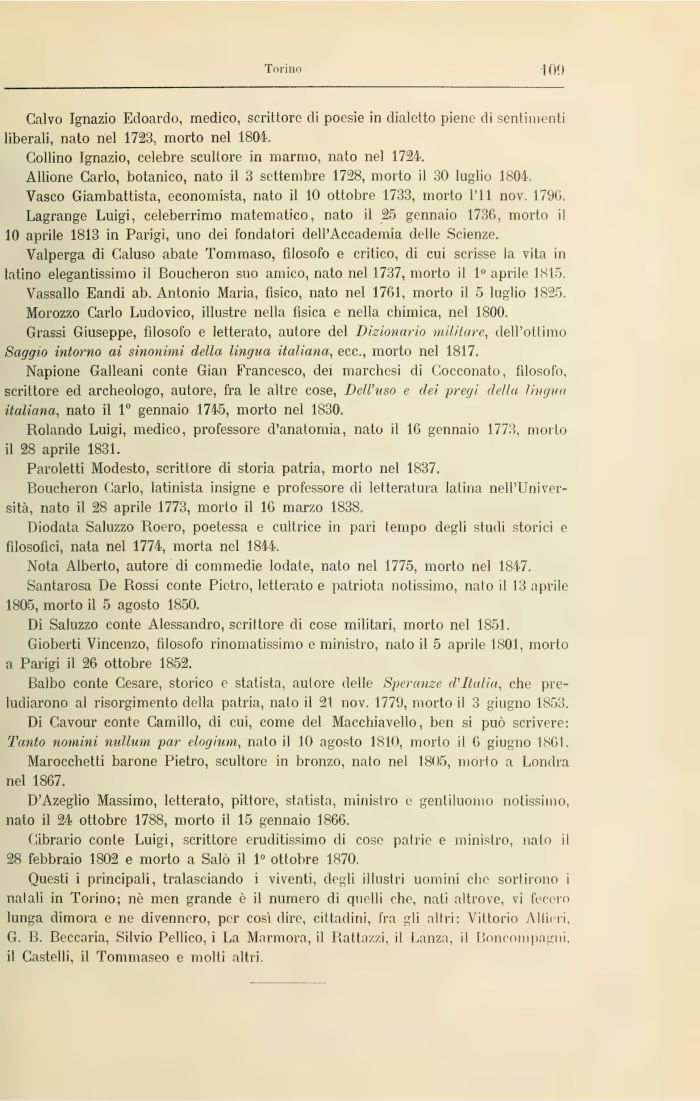 Questi i principali, tralasciando i viventi, degli illustri uomini che sortirono i natali in Torino; nò men grande è il numero di quelli che, nati altrove, vi fecero lunga dimora e ne divennero, por così dire, cittadini, fra gli altri: Vittorio Alfieri, G. B. Beccaria, Silvio Pellico, i La Mormora, il Rattazzi, il Lanza, il Boncompagni, il Castelli, il Tommaseo e molti altri,