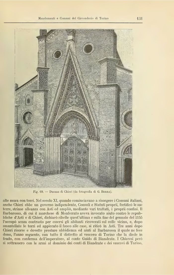 alte mura con torri. Nel secolo XI, quando cominciavano a risorgere i Comuni italiani, anche Chieri ebbe un governo indipendente, Consoli e Statuti proprii, fortificò le sue terre, strinse alleanza con Asti ed ampliò, mediante vari trattati, i proprii confini. Il Barbarossa, di cui il marchese di Monferrato aveva invocato aiuto contro le repubbliche dAsti e di Chieri, dichiarò ribelle quest'ultima e sulla fine del gennaio del 1155 l'occupò senza contrasto per essersi gli abitanti ricoverati sul colle vicino, e, dopo smantellate le torri ed appiccato il fuoco alle case, si ritirò in Asti. Tre anni dopo Chieri risorse e dovette prestare ubbidienza ed aiuti al Barbarossa il quale ne fece dono, l'anno seguente, con tutto il distretto al vescovo di Torino che la diede in feudo, con conferma dell'imperatore, al conte Guido di Biandrate. I Chieresi però si sottrassero con le armi al dominio dei conti di Biandrate e dei vescovi di Torino,