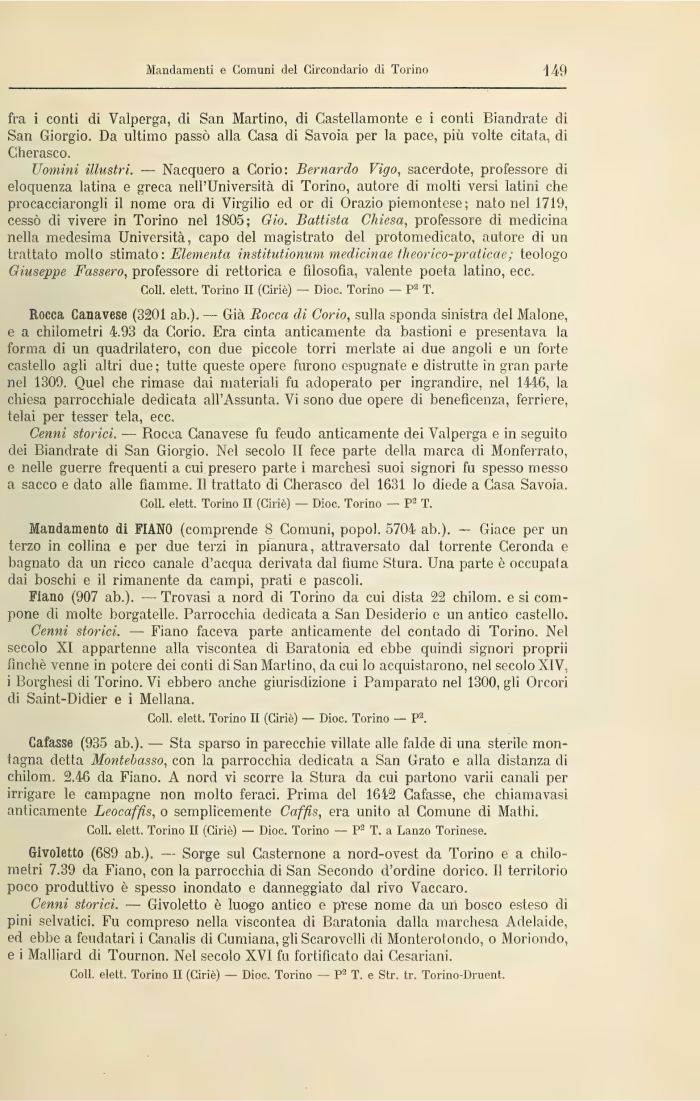 Uomini illustri. — Nacquero a Corio: Bernardo Vigo, sacerdote, professore di eloquenza latina e greca nell'Università di Torino, autore di molti versi latini che procacciarongli il nome ora di Virgilio ed or di Orazio piemontese; nato nel 1719, cessò di vivere in Torino nel 1805; Gio. Battista Chiesa, professore di medicina nella medesima Università, capo del magistrato del protomedicato, autore di un trattato mollo stimato : Elementa institutionum medicinae theorico-praticae; teologo Giuseppe Fassero, professore di rettorica e filosofia, valente poeta latino, ecc.