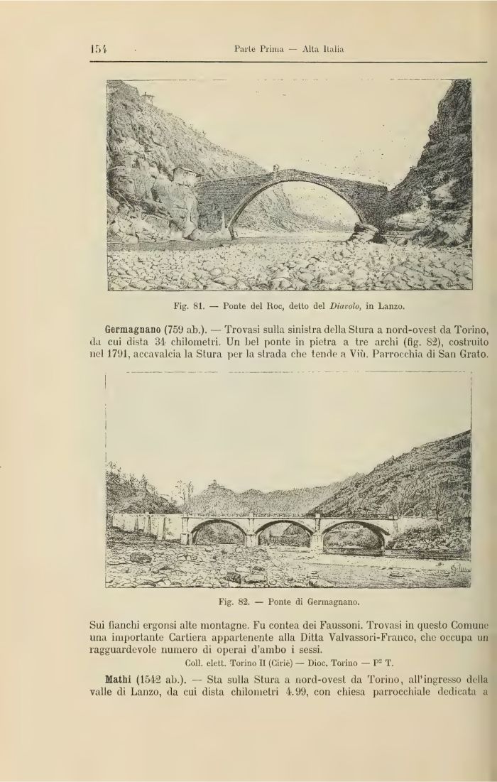 Germagnano (759 ab.). Trovasi sulla sinistra della Stura a nord-ovest da Torino, da cui dista 84 chilometri. Un bel ponte in pietra a tre archi (fig. 82), costruito ne! 1791, accavalcia la Stura per la strada che tende a Vi๙. Parrocchia di San Grato.