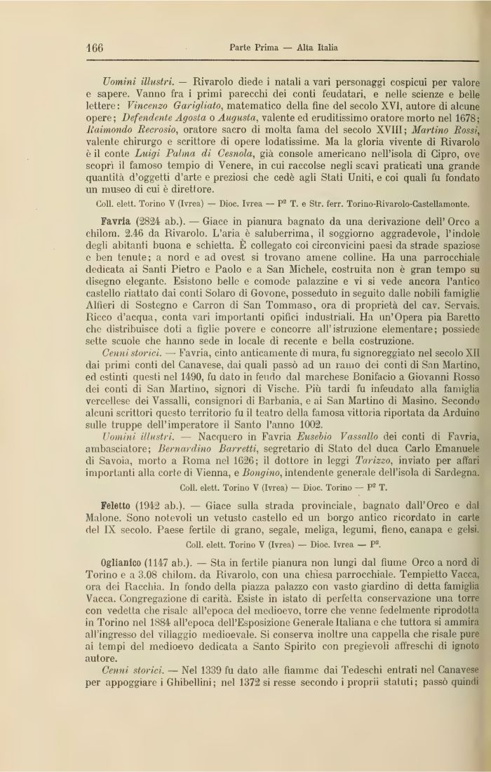 Favria (2824 ab.). — Giace in pianura bagnato da una derivazione dell' Orco a chilom. 2.46 da Rivarolo. L'aria è saluberrima, il soggiorno aggradevole, l'indole degli abitanti buona e schietta. È collegato coi circonvicini paesi da strade spaziose e ben tenute; a nord e ad ovest si trovano amene colline. Ha una parrocchiale dedicata ai Santi Pietro e Paolo e a San Michele, costruita non è gran tempo su disegno elegante. Esistono belle e comode palazzine e vi si vede ancora l'antico castello riattato dai conti Solaro di Govone, posseduto in seguito dalle nobili famiglie Alfieri di Sostegno e Carron di San Tommaso, ora di proprietà del cav. Servais. Ricco d'acqua, conta vari importanti opifici industriali. Ha un'Opera pia Baretto che distribuisce doti a figlie povere e concorre all'istruzione elementare; possiede sette scuole che hanno sede in locale di recente e bella costruzione.