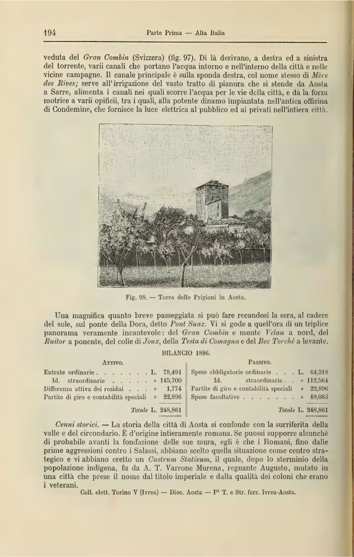veduta del Gran Combin (Svizzera) (fig. 97). Di là derivano, a destra ed a sinistra del torrente, varii canali che portano l'acqua intorno e nell'interno della città e nelle vicine campagne. Il canale principale è sulla sponda destra, col nome stesso di Mère des Rives; serve all'irrigazione del vasto tratto di pianura che si stende da Aosta a Sarre, alimenta i canali nei quali scorre l'acqua per le vie della città, e dà la forza motrice a varii opificii, tra i quali, alla potente dinamo impiantata nell'antica officina di Gondemine, che fornisce la luce elettrica al pubblico ed ai privati nell'intiera città.