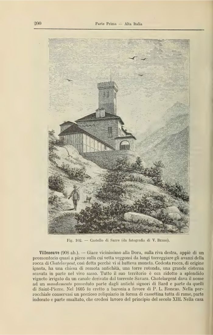 Villeneuve (908 ab.). — Giace vicinissimo alla Dora, sulla riva destra, appiè di un promontorio quasi a picco sulla cui vetta veggonsi da lungi torreggiare gli avanzi della rocca di Chatelargent, così detta perchè vi si batteva moneta. Codesta rocca, di origine ignota, ha una chiesa di remota antichità, una torre rotonda, una grande cisterna scavata in parte nel vivo sasso. Tutto il suo territorio è ora ridotto a splendido vigneto irrigato da un canale derivato dal torrente Savara. Chatelargent dava il nome ad un mandamento posseduto parte dagli antichi signori di Bard e parte da quelli di Saint-Pierre. Nel 1605 fu eretto a baronìa a favore di P. L. Roncas. Nella parrocchiale conservasi un prezioso reliquiario in forma di cassettina tutta di rame, parte indorato e parte smaltato, che credesi lavoro del principio del secolo XIII. Nella casa