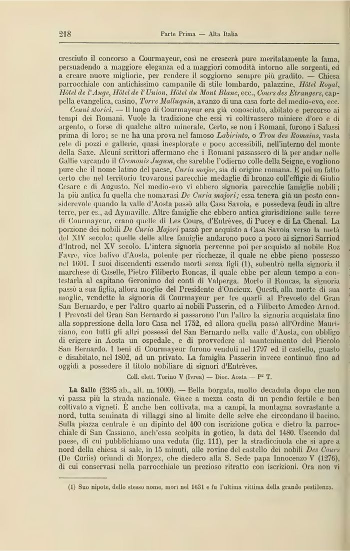 Cenni storici. — Il luogo di Courmayeur era già conosciuto, abitato e percorso ai tempi dei Romani. Vuole la tradizione che essi vi coltivassero miniere d'oro e di argento, o forse di qualche altro minerale. Certo, se non i Romani, furono i Salassi prima di loro; se ne ha una prova nel famoso Labirinto, o Trou des Romains, vasta rete di pozzi e gallerie, quasi inesplorate e poco accessibili, nell'interno del monte della Saxe. Alcuni scrittori affermano che i Romani passassero di là per andar nelle Gallie varcando il Cremonis Jugum, che sarebbe l'odierno colle della Seigne, e vogliono pure che il nome latino del paese, Curia major, sia di origine romana. E poi un fatto certo che nel territorio trovaronsi parecchie medaglie di bronzo coll'effigie di Giulio Cesare e di Augusto. Nel medio-evo vi ebbero signoria parecchie famiglie nobili ; la più antica fu quella che nomavasi De Curia majori; essa teneva già un posto considerevole quando la valle d'Aosta passò alla Casa Savoia, e possedeva feudi in altre terre, per es., ad Aymaville. Altre famiglie che ebbero antica giurisdizione sulle terre di Courmayeur, erano quelle di Les Cours, d'Entrèves, di Pucey e di La Chenal. La porzione dei nobili De Curia Majori passò per acquisto a Casa Savoia verso la metà del XIV secolo; quelle delle altre famiglie andarono poco a poco ai signori Sarriod d'Introd, nel XV secolo. L'intera signoria pervenne poi per acquisto al nobile Roz Favre, vice balivo d'Aosta, potente per ricchezze, il quale ne ebbe pieno possesso nel 1601. I suoi discendenti essendo morti senza figli (1), subentrò nella signoria il marchese di Caselle, Pietro Filiberto Roncas, il quale ebbe per alcun tempo a contestarla al capitano Geronimo dei conti di Valperga. Morto il Roncas, la signoria passò a sua figlia, allora moglie del Presidente d'Oncieux. Questi, alla morte di sua moglie, vendette la signoria di Courmayeur per tre quarti al Prevosto del Gran San Bernardo, e per l'altro quarto ai nobili Passerin, ed a Filiberto Amedeo Arnod. I Prevosti del Gran San Bernardo si passarono l'un l'altro la signoria acquistata fino alla soppressione della loro Casa nel 1752, ed allora quella passò all'Ordine Mauri-ziano, con tutti gli altri possessi del San Bernardo nella valle d'Aosta, con obbligo di erigere in Aosta un ospedale, e di provvedere al mantenimento del Piccolo San Bernardo. I beni di Courmayeur furono venduti nel 1797 ed il castello, guasto e disabitato, nel 1802, ad un privato. La famiglia Passerin invece continuò fino ad oggidì a possedere il titolo nobiliare di signori d'Entrèves.