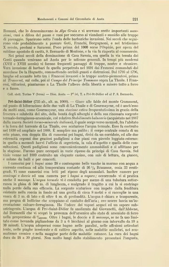 Pré-Saint-Didier (735 ab., alt. m. 1000). — Giace alle falde del monte Crammont, sul punto di biforcazione delle due valli dì La Thuile e di Courmayeur, ed è anch'esso da molti anni, come Courmayeur, una stazione estiva frequentatissima in grazia della frescura e salubrità del sito, della bontà degli alberghi e della sua rinomata sorgente termale-ferruginosa-arsenicale, col relativo Stabilimento balneario (acquistato nel 1887 dalla nuova Società termo-minerale italiana), il quale sorge verso mezzodì, fra l'abitato e la forra del torrente di La Thuile, ove scaturisce l'acqua termale. Esso fu costruito nel 1830 ed ampliato nel 1888. È semplice ma pulito : il corpo centrale consta di un solo piano, con doppia fila di camerini pei bagni, divisi da un corridoio, ed alle due estremità ergonsi due graziosi padiglioni a due piani con piccolo loggiato esterno: in quello a mezzodì havvi l'ufficio di segreteria, la sala d'aspetto e quella delle consultazioni. Questi padiglioni sono convenientemente ammobiliati e si affittano per la stagione. Furono pure occupati in varie riprese da principi di Casa Savoia. Sul viale venne nel 1889 costruito un elegante casino, con sale di lettura, da giuoco, e salone da balli e per concerti.
