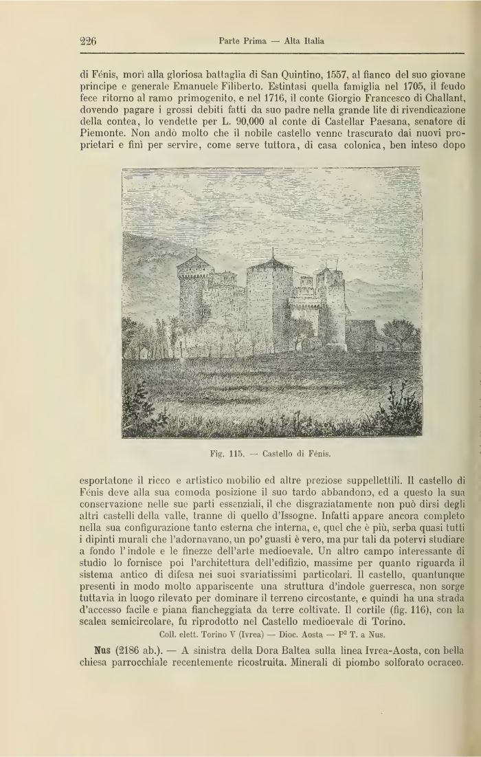 di Fénis, morì alla gloriosa battaglia di San Quintino, 1557, al fianco del suo giovane principe e generale Emanuele Filiberto. Estintasi quella famiglia nel 1705, il feudo fece ritorno al ramo primogenito, e nel 1716, il conte Giorgio Francesco di Challant, dovendo pagare i grossi debiti fatti da suo padre nella grande lite di rivendicazione della contea, lo vendette per L. 90,000 al conte di Castellar Paesana, senatore di Piemonte. Non andò molto che il nobile castello venne trascurato dai nuovi proprietari e finì per servire, come serve tuttora, di casa colonica, ben inteso dòpo
