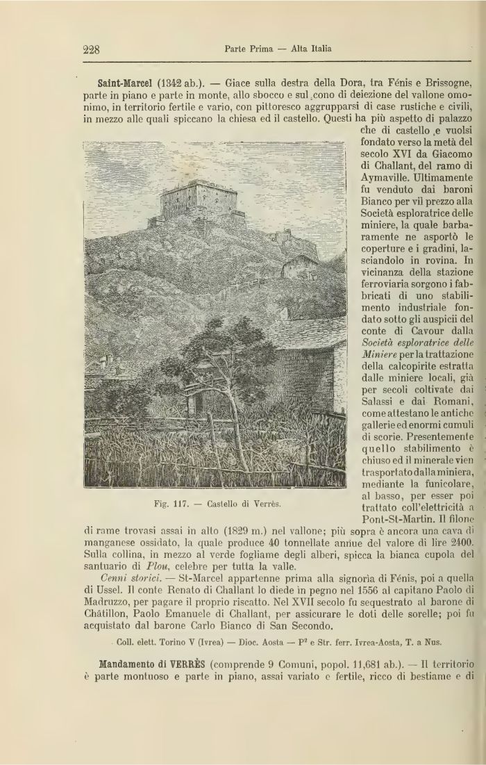 che di castello ,e vuoisi fondato verso la metà del secolo XVI da Giacomo di Challant, del ramo di Aymaville. Ultimamente fu venduto dai baroni Bianco per vii prezzo alla Società esploratrice delle miniere, la quale barbaramente ne asportò le coperture e i gradini, lasciandolo in rovina. In vicinanza della stazione ferroviaria sorgono i fabbricati di uno stabilimento industriale fondato sotto gli auspicii del conte di Cavour dalla Società esploratrice delle Miniere per la trattazione della calcopirite estratta dalle miniere locali, già per secoli coltivate dai Salassi e dai Romani, come attestano le antiche gallerie ed enormi cumuli di scorie. Presentemente quello stabilimento è chiuso ed il minerale vien trasportato dallaminiera, mediante la funicolare, al basso, per esser poi trattato coll'elettricità a Pont-St-Martin. Il filone