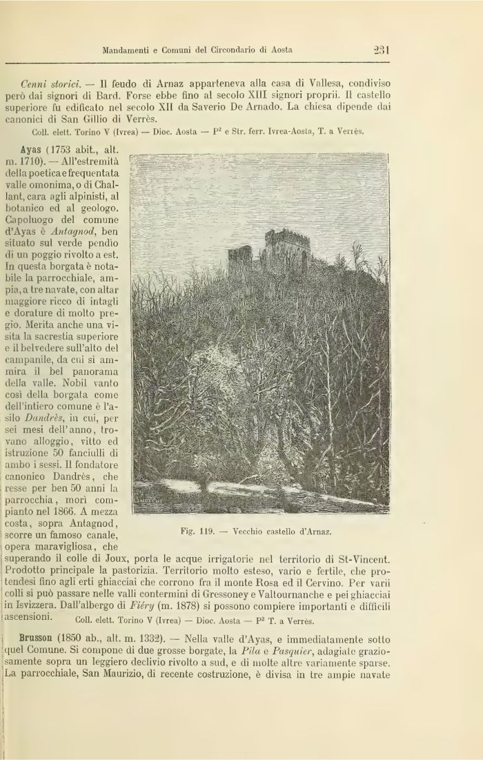 Ayas (1753 abit., alt. ni. 1710). — All'estremità della poetica e frequentata valle omonima, o di Challant, cara agli alpinisti, al botanico ed al geologo. Capoluogo del comune d'Ayas è Antagnod, ben situato sul verde pendìo di un poggio rivolto a est. In questa borgata è notabile la parrocchiale, ampia, a tre navate, con aitar maggiore ricco di intagli e dorature di molto pregio. Merita anche una visita la sacrestia superiore e il belvedere sull'alto del campanile, da cui si ammira il bel panorama della valle. Nobil vanto così della borgata come dell'intiero comune è l'asilo Dandrès, in cui, per sei mesi dell'anno, trovano alloggio, vitto ed istruzione 50 fanciulli di ambo i sessi. Il fondatore I canonico Dandrès, che ; resse per ben 50 anni la parrocchia, morì compianto nel 1866. A mezza costa, sopra Antagnod, scorre un famoso canale, Fig- 119' ~ Vecchio castell° d'Arnaz-