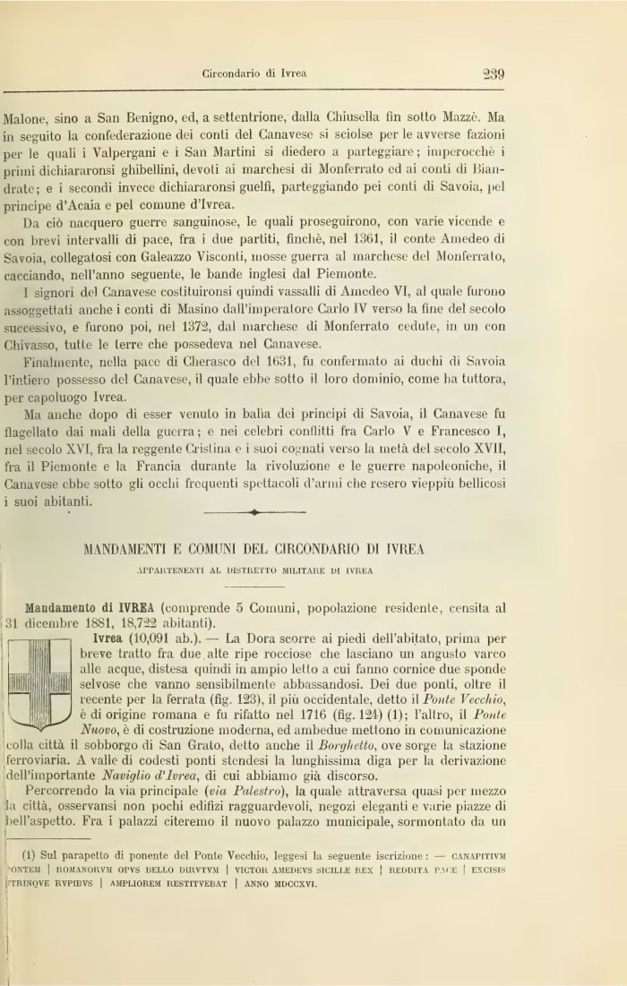 Ivrea (10,091 ab.). — La Dora scorre ai piedi dell'abitato, prima per breve tratto fra due alte ripe rocciose che lasciano un angusto varco alle acque, distesa quindi in ampio letto a cui fanno cornice due sponde selvose che vanno sensibilmente abbassandosi. Dei due ponti, oltre il recente per la ferrata (fig. 123), il più occidentale, detto il Ponte Vecchio, è di origine romana e fu rifatto nel 1716 (fig. 124) (1); l'altro, il Ponte Nuovo, è di costruzione moderna, ed ambedue mettono in comunicazione colla città il sobborgo di San Grato, detto anche il Borghetto, ove sorge la stazione ferroviaria. A valle di codesti ponti stendesi la lunghissima diga per la derivazione dell'importante Naviglio d'Ivrea, di cui abbiamo già discorso.