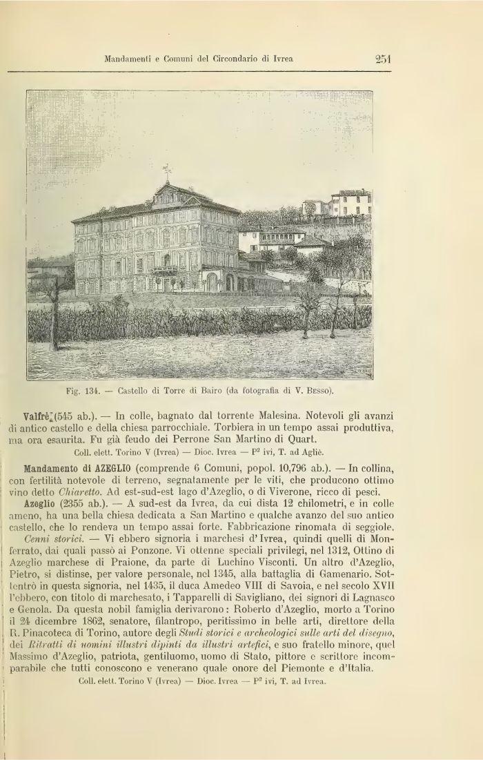 Cenni storici. — Vi ebbero signoria i marchesi d'Ivrea, quindi quelli di Mon-1 ferrato, dai quali passò ai Ponzone. Vi ottenne speciali privilegi, nel 1312, Ottino di I Azeglio marchese di Praìone, da parte di Luchino Visconti. Un altro d'Azeglio, Pietro, si distinse, per valore personale, nel 1345, alla battaglia di Gamenario. Sottentrò in questa signoria, nel 1435, il duca Amedeo Vili di Savoia, e nel secolo XVII l'ebbero, con titolo di marchesato, i Tapparelli di Savigliano, dei signori di Lagnasco e Genola. Da questa nobil famiglia derivarono : Roberto d'Azeglio, morto a Torino il 24 dicembre 1862, senatore, fdantropo, peritissimo in belle arti, direttore della , R. Pinacoteca di Torino, autore degli Studi storici e archeologici sulle arti del disegno, , dei Ritratti di uomini illustri dipinti da illustri artefici, e suo fratello minore, quel Massimo d'Azeglio, patriota, gentiluomo, uomo di Stato, pittore e scrittore incom-! parabile che tutti conoscono e venerano quale onore del Piemonte e d'Italia.