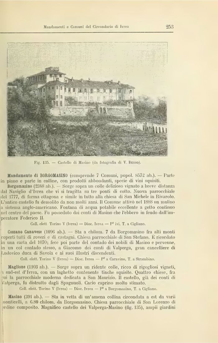 Masino (391 ab.). Sta in vetta di un'amena collina circondata a est da varii nonticelli, a 6.80 chilom. da Borgomasino. Chiesa parrocchiale di San Lorenzo di prdine composito. Magnifico castello dei Valperga-Masino (fig. 135), ampii giardini