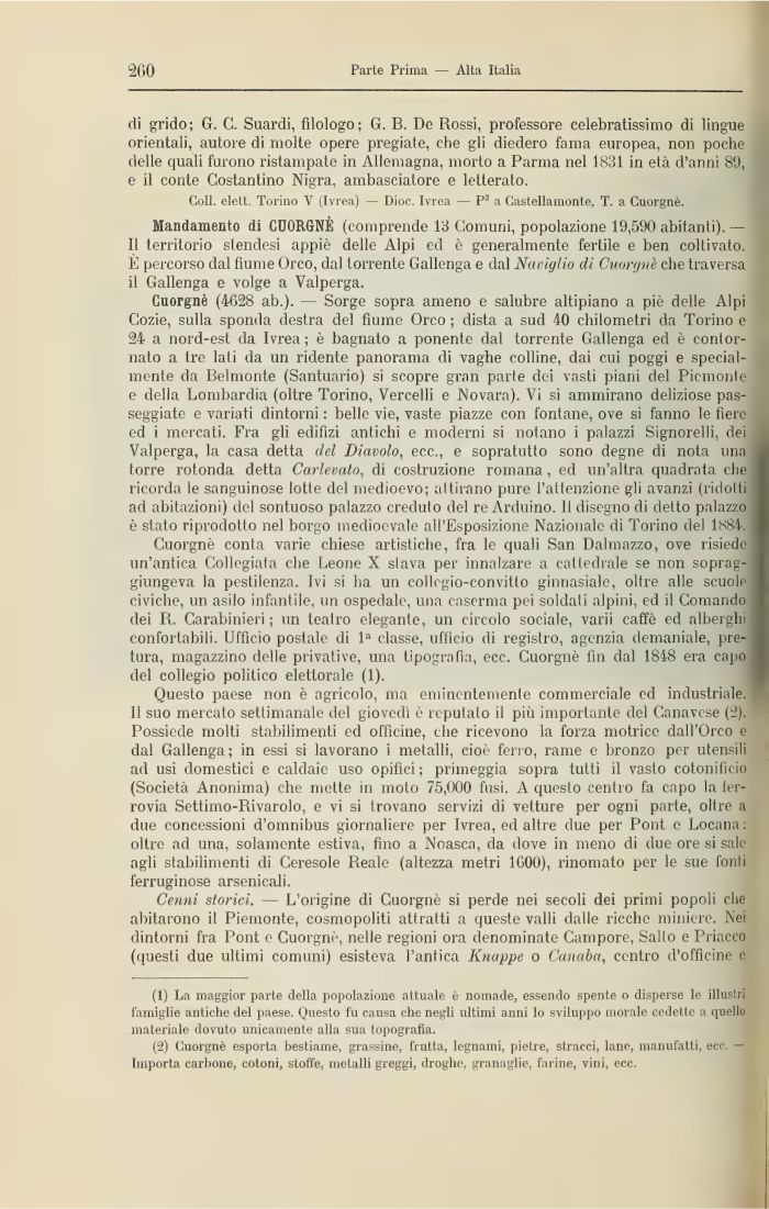 (2) Cuorgnè esporta bestiame, grassine, frutta, legnami, pietre, stracci, lane, manufatti, ecc. — Importa carbone, cotoni, stoffe, metalli greggi, droghe, granaglie, farine, vini, ecc.