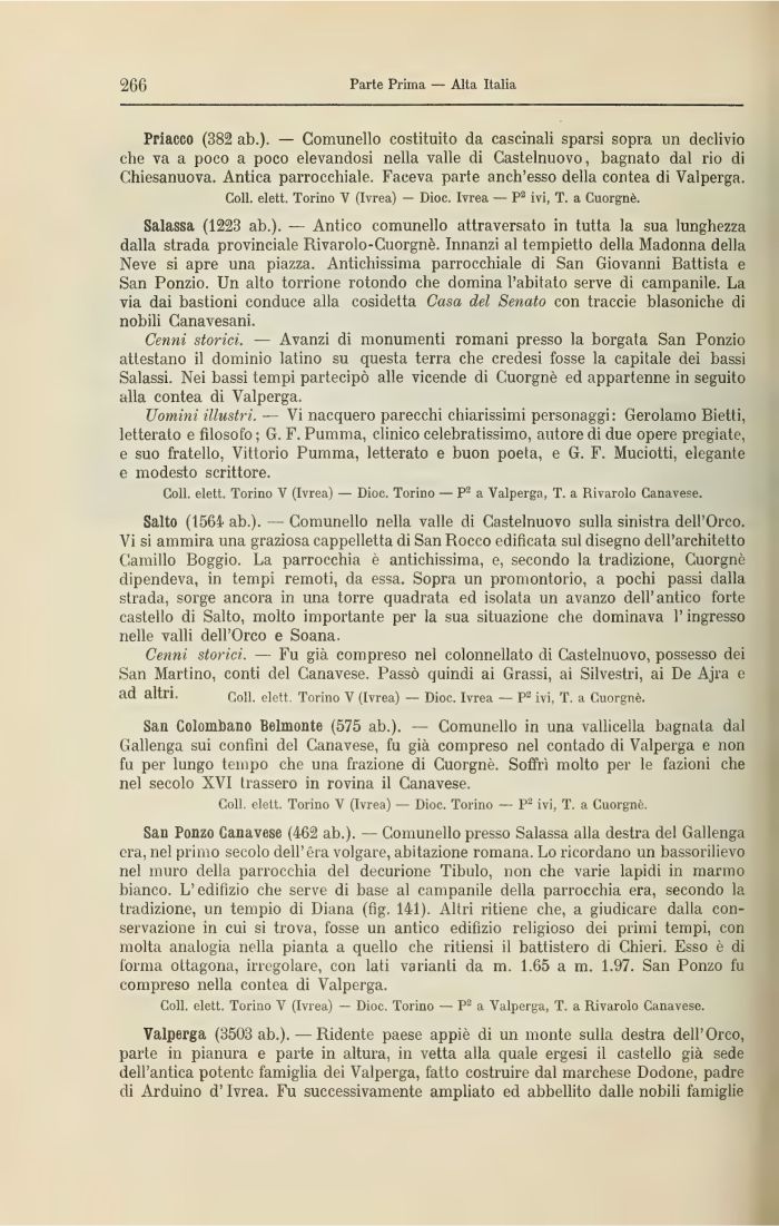 Salassa (1223 ab.). — Antico comunello attraversato in tutta la sua lunghezza dalla strada provinciale Rivarolo-Cuorgnč. Innanzi al tempietto della Madonna della Neve si apre una piazza. Antichissima parrocchiale di San Giovanni Battista e San Ponzio. Un alto torrione rotondo che domina l'abitato serve di campanile. La via dai bastioni conduce alla cosidetta Casa del Senato con traccie blasoniche di nobili Canavesani.